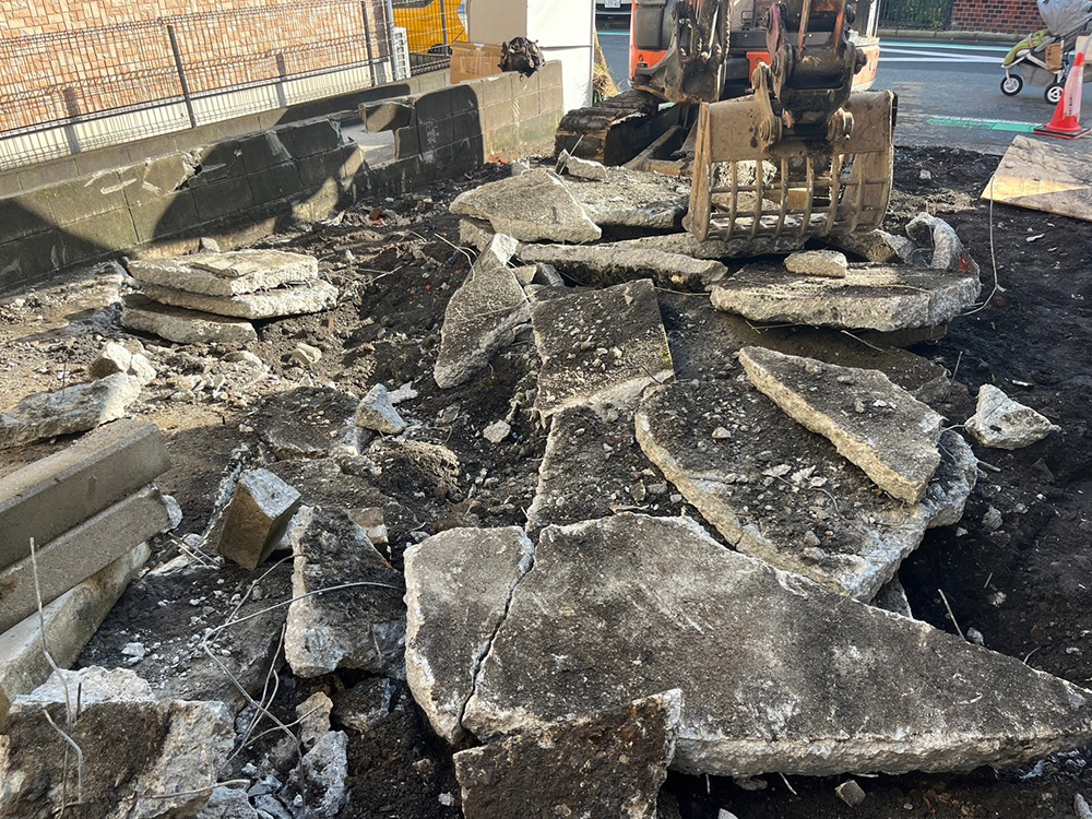 アスファルトの厚さ約15〜20cmでしたが、ワイヤーメッシュが使用されていたため、順調に撤去作業を進められました。安全に運搬するために可能な限り細かくしてトラックへの積み込み作業を行います。廃材が地中へ埋もれてしまった場合はスケルトンバケットでふるい作業を行い、細かいアスファルトも残しません。また、アスファルトの撤去時に埋設物がありました。弊社では事前に把握していない埋設物を確認した際には、施工をストップし、施主に報告をしてから適切に対処を行うことを徹底しております。今回は埋設物の撤去を行う流れになりましたので、アスファルトと同時に埋設物の撤去も進めていきます。