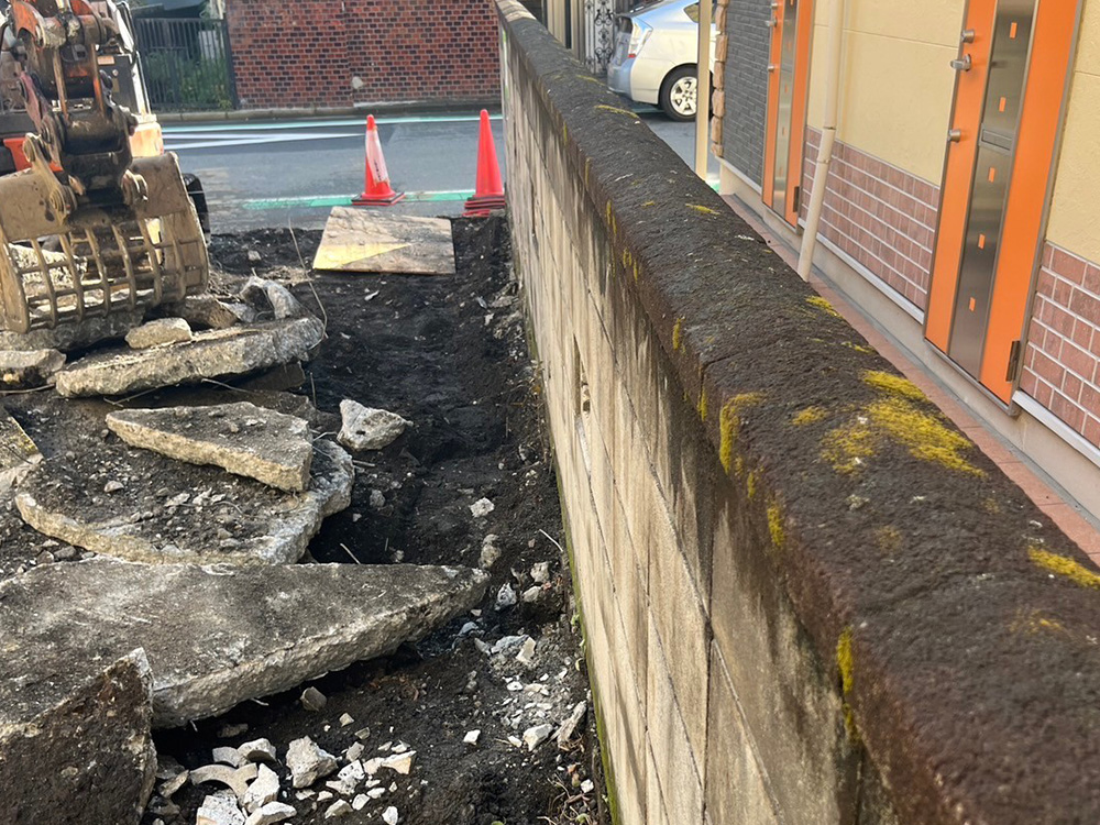 アスファルトの撤去工事が完了したら、次に外周ブロックの解体に着手します。やや高さのあるブロック塀のため、隣接するアパート側へ倒壊しないよう目地部分に切り込みを入れながら慎重に解体工事を進めました。また、ブロック塀と隣接するアパートのコンクリート土間が密着していたため、サンダーやハンマードリルなどを活用して慎重に工事を行います。隣接するコンクリート土間と完全に縁が切れたら、重機でブロック塀の基礎部分も撤去しています。