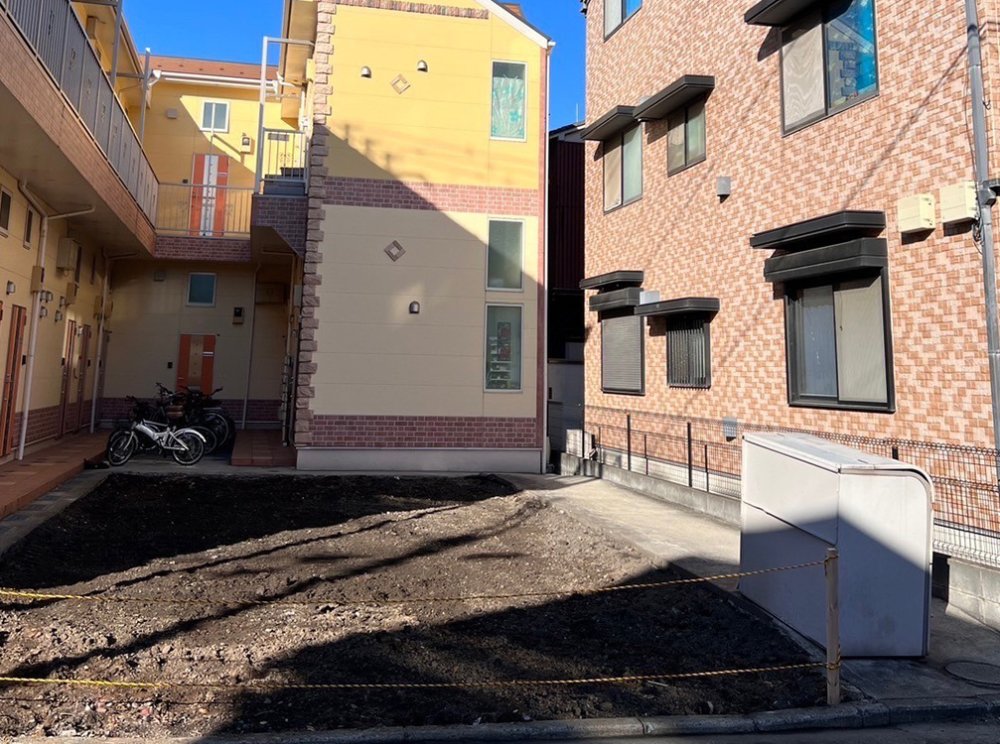 なお、解体工事を始める前に近隣への声掛けをしてから施工を開始しました。近隣に住宅や商業施設がある場合などには、施工前の挨拶を必ず行っております。また、隣接するアパートと外周ブロックの距離が近いため、必要に応じて養生シートを活用するなど、周囲への配慮やクレームに繋がらないよう細心の注意を払います。