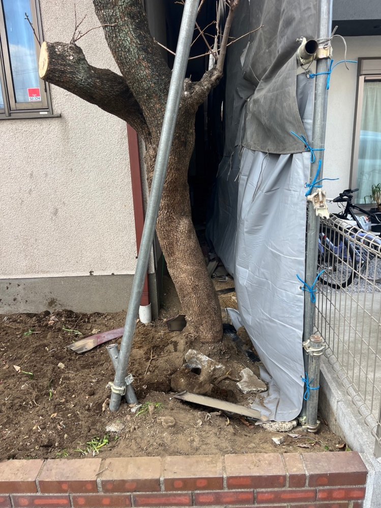 今回は敷地や庭が広いため、作業や廃材置き場のスペースを確保しやすく、比較的スムーズに解体工事を進められました。ただし、隣接する家屋との距離が非常に近かったので、その点は気を遣いながら作業を行いました。また、木くずやコンクリートの粉塵などが飛散しないように足場を建設し、養生シートを張って予防します。解体工事着工前の挨拶や声かけも忘れません。