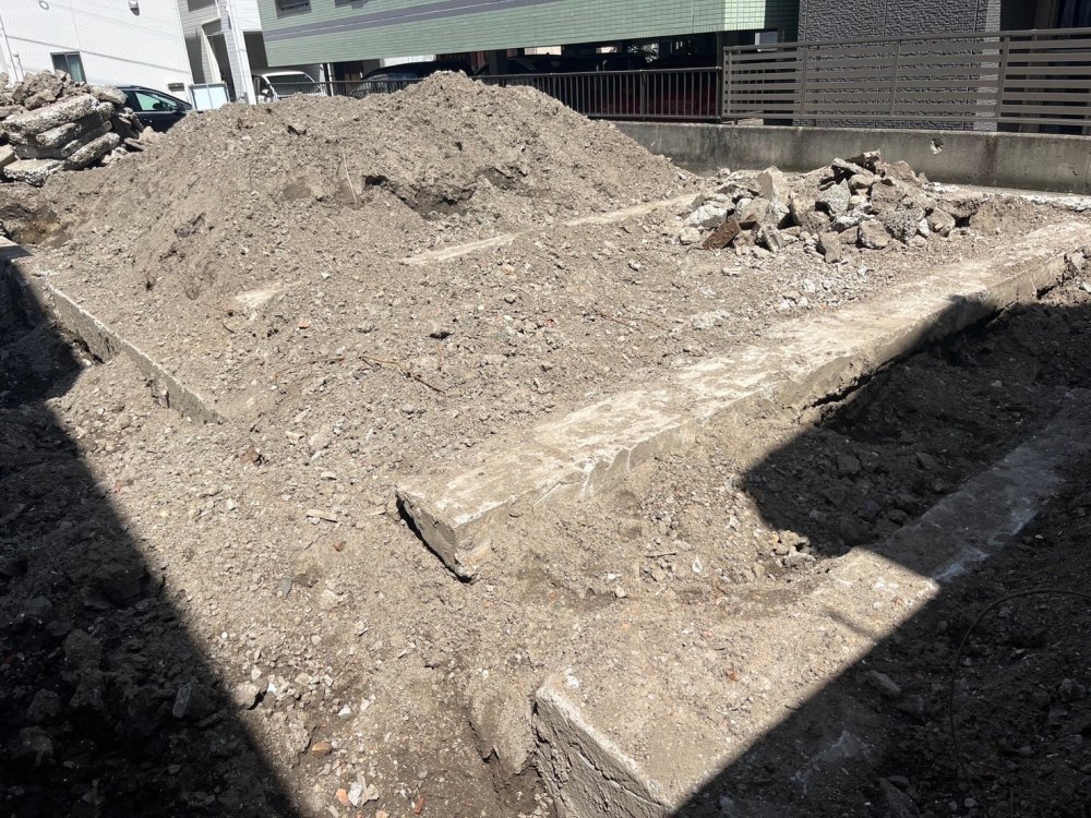 布基礎・杭基礎・ベタ基礎・直接基礎といった埋設物の確認完了後は、重機のアタッチメントをブレーカーに付け替えてはつり作業を行います。大型の重機による解体工事ができないため、布基礎・杭基礎・ベタ基礎などの端を少しづつはつります。基礎は鉄筋コンクリートなので、はつり作業と並行しながら鉄筋とコンクリートを分別しました。また、細かく解体したコンクリート基礎はトラックで運搬します。コンクリート基礎が撤去できた部分に関しては、重機の足元を整えるためにも埋め戻し作業を実施します。深く掘削した地盤は軟弱になりやすく、雨などで沈下する恐れがあるため、重機の荷重を利用してしっかりと転圧作業も行います。