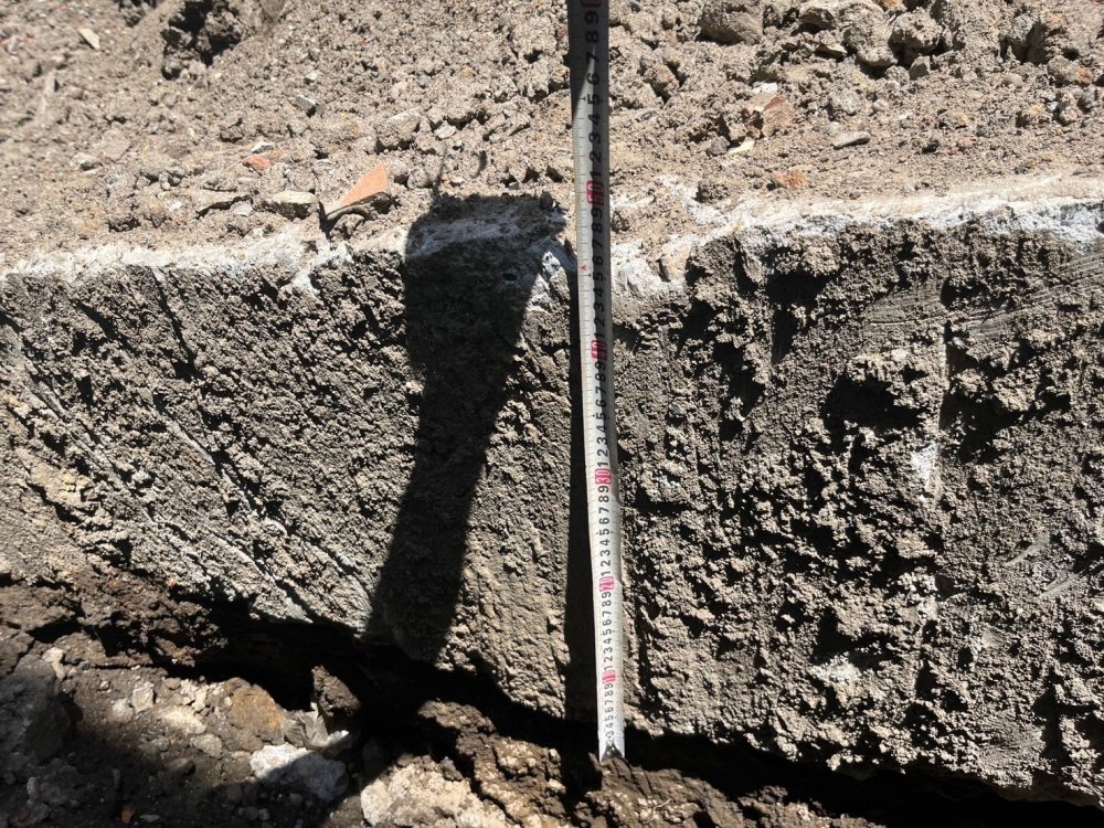 地中に埋設されている鉄筋コンクリートの構造や厚みなどを把握するために、重機で基礎の周囲を掘り起こす作業から取り掛かります。施主様から預かった建物の見取り図を確認しながら見落としがないように掘り進めていきます。実際に掘り起こすと布基礎・杭基礎・ベタ基礎・直接基礎など、さまざまなコンクリート基礎が埋設されていると確認できました。特にしっかりとした厚みのある布基礎や杭基礎があるため、重機によって掘り起こしてから徐々にブレーカーで解体工事を進めていきます。
