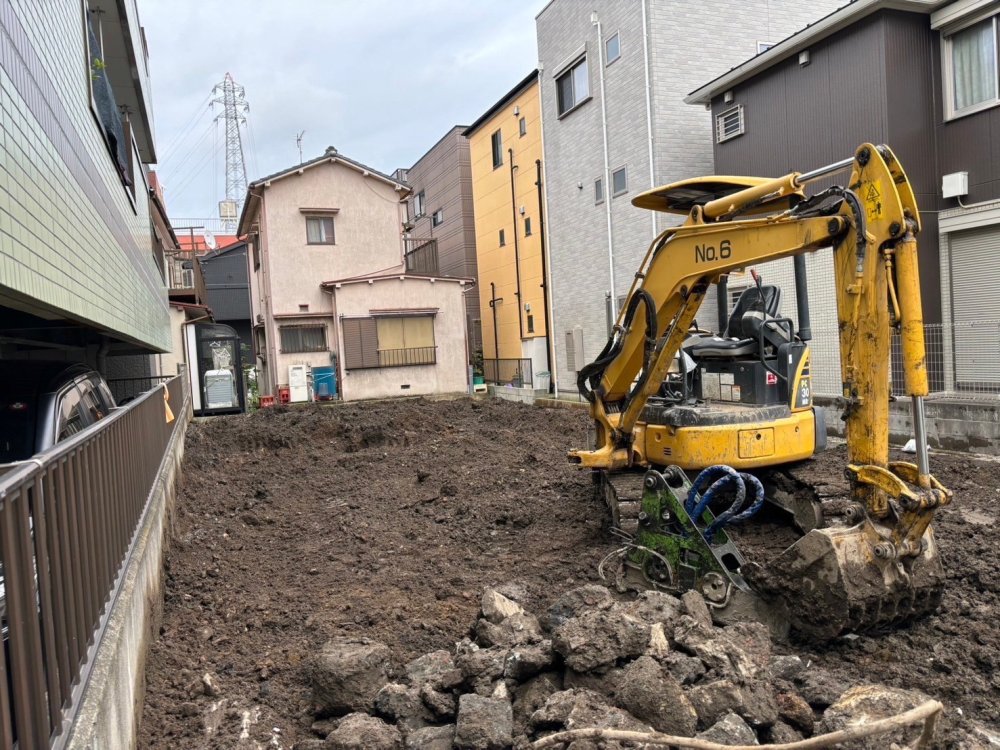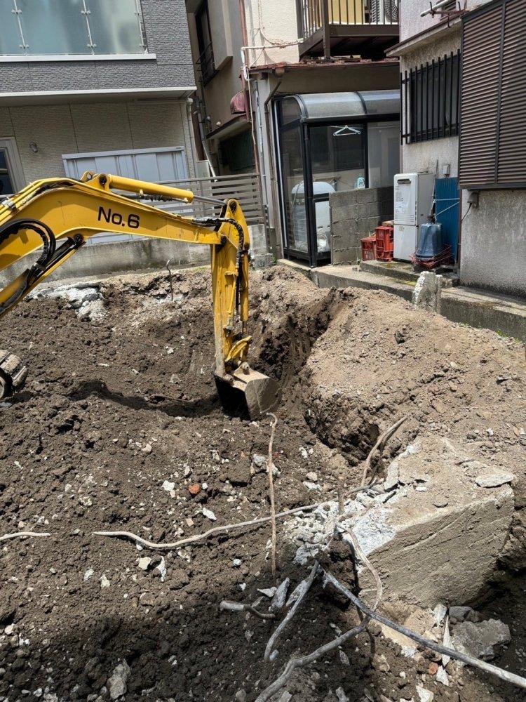 地中に埋設されているコンクリート基礎の厚みは約50〜70cmと分厚いため、地盤を掘削してコンクリート基礎の周囲を掘り起こしてからブレーカーで細かく解体する必要がありました。また、敷地内が狭いほか、隣接する家屋との距離が近いので、コンパクトサイズの重機で解体作業を進めていきます。弊社では着工前に挨拶や声かけを徹底し、クレームに繋がらないよう配慮しながら解体工事を行います。