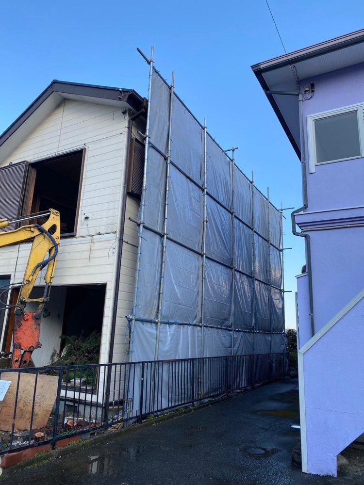 整形地で作業しやすい現場でしたが、外構の撤去範囲が複雑だったので作業班と入念に打ち合わせをしながら解体工事を進めました。また、隣接する住宅の距離が近いため、単管足場を建設しました。木くずやコンクリートガラなどが飛散する可能性があり、単管足場に養生シートを張ることで対策します。弊社では近隣の方への挨拶や声かけも欠かさず実施しており、クレームなどに繋がらないよう積極的にコミュニケーションを取っております。